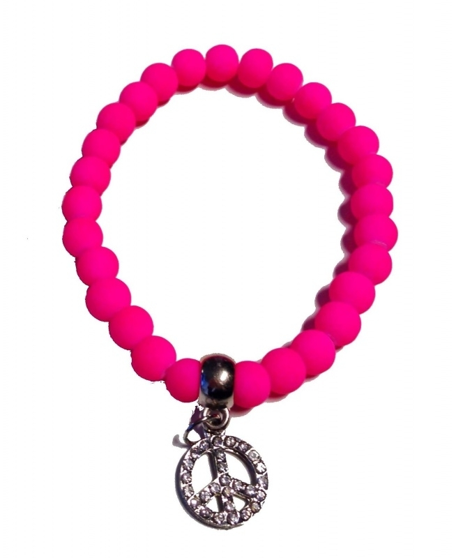 Lief fluor roze armbandje met peace bedeltje, ingelegd met glitter steentjes.