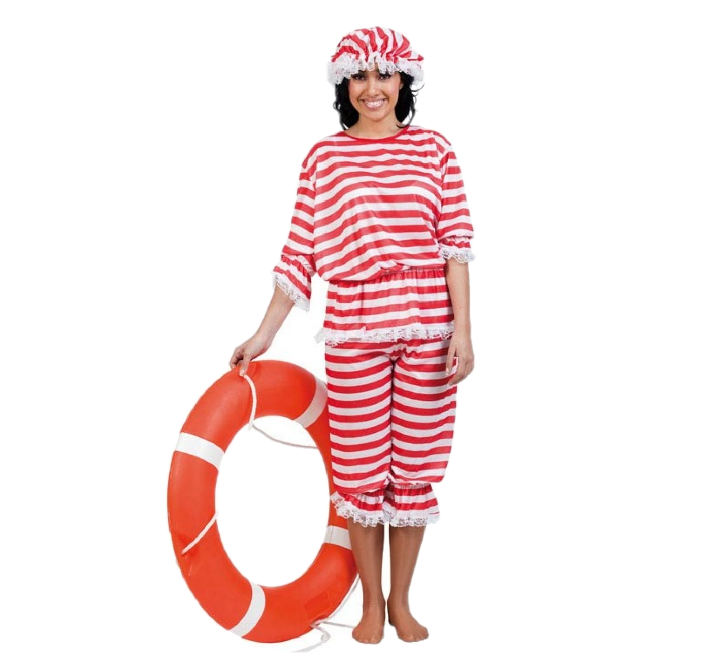 Rood wit gestreept ouderwets badpak kostuum van het merk Fyasa. Deze verkleedkleding is gemaakt voor vrouwen met maat XL. Dit kostuum bestaat uit: jumpsuit en muts.