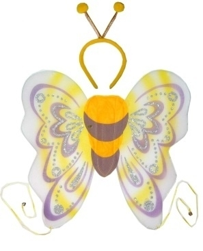 Set bestaat uit vleugels die je op je rug kan doen en een bijtje haarband.