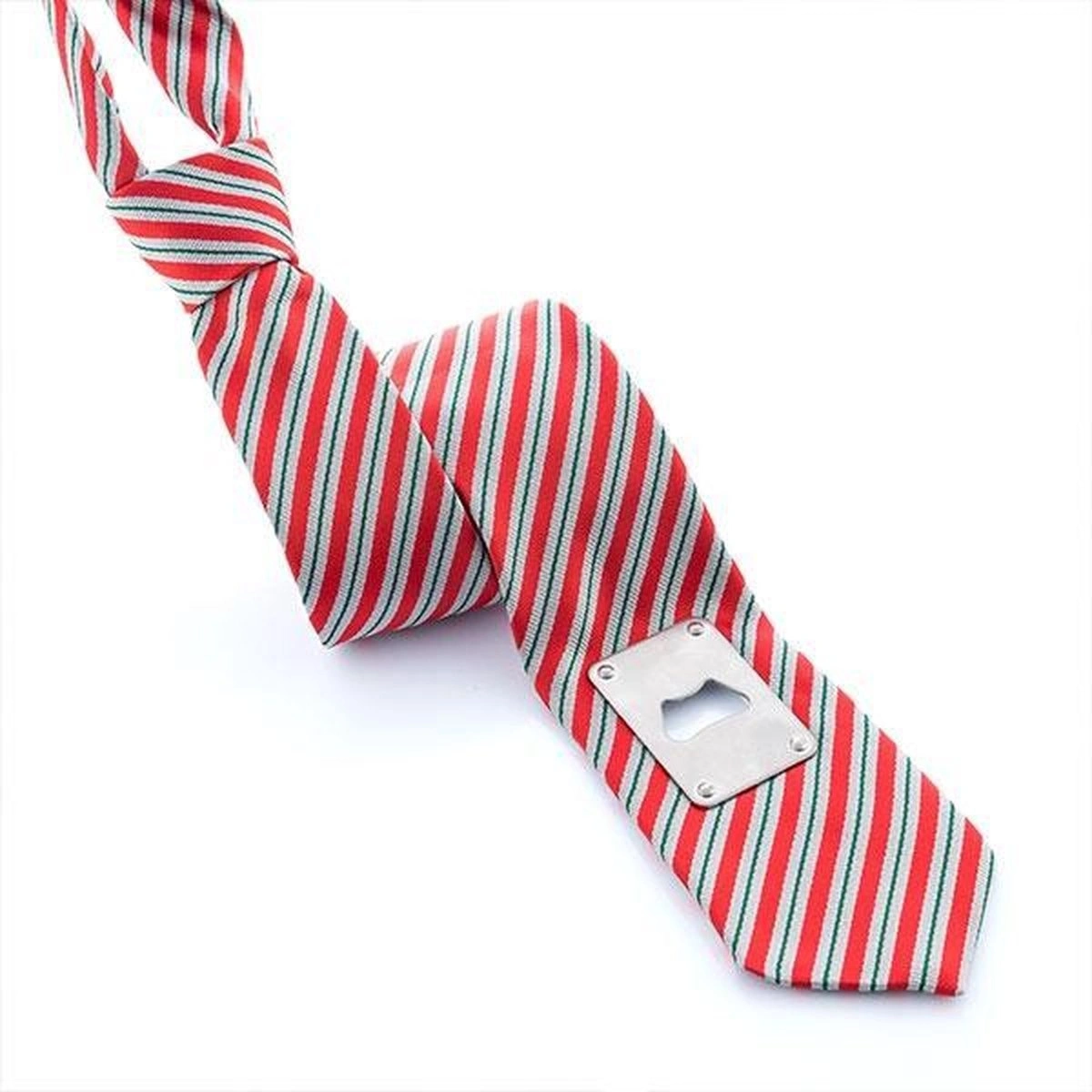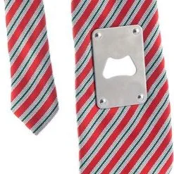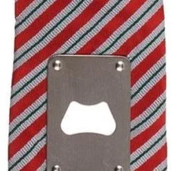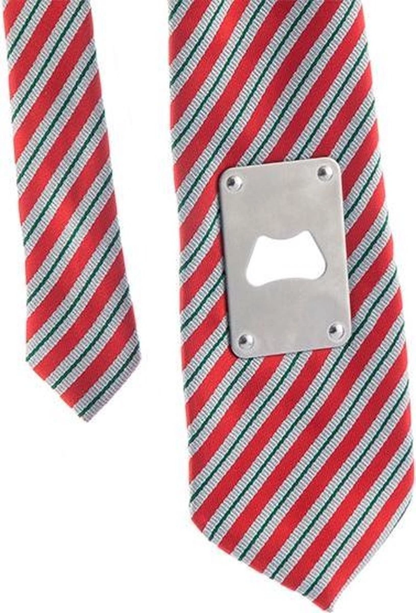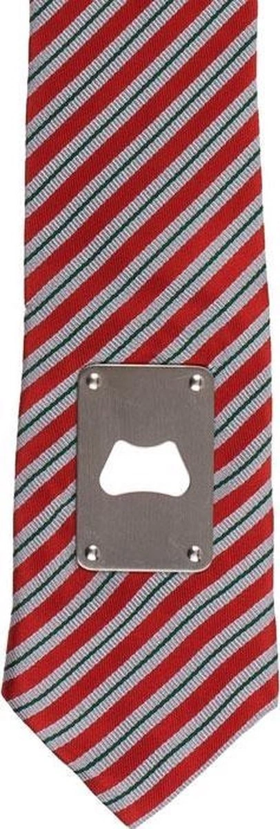 Rood met wit gestreepte stropdas van 140 cm. Deze stropdas is een heel stuk handiger dan een normale stropdas. Deze stropdas heeft namelijk een bieropener!