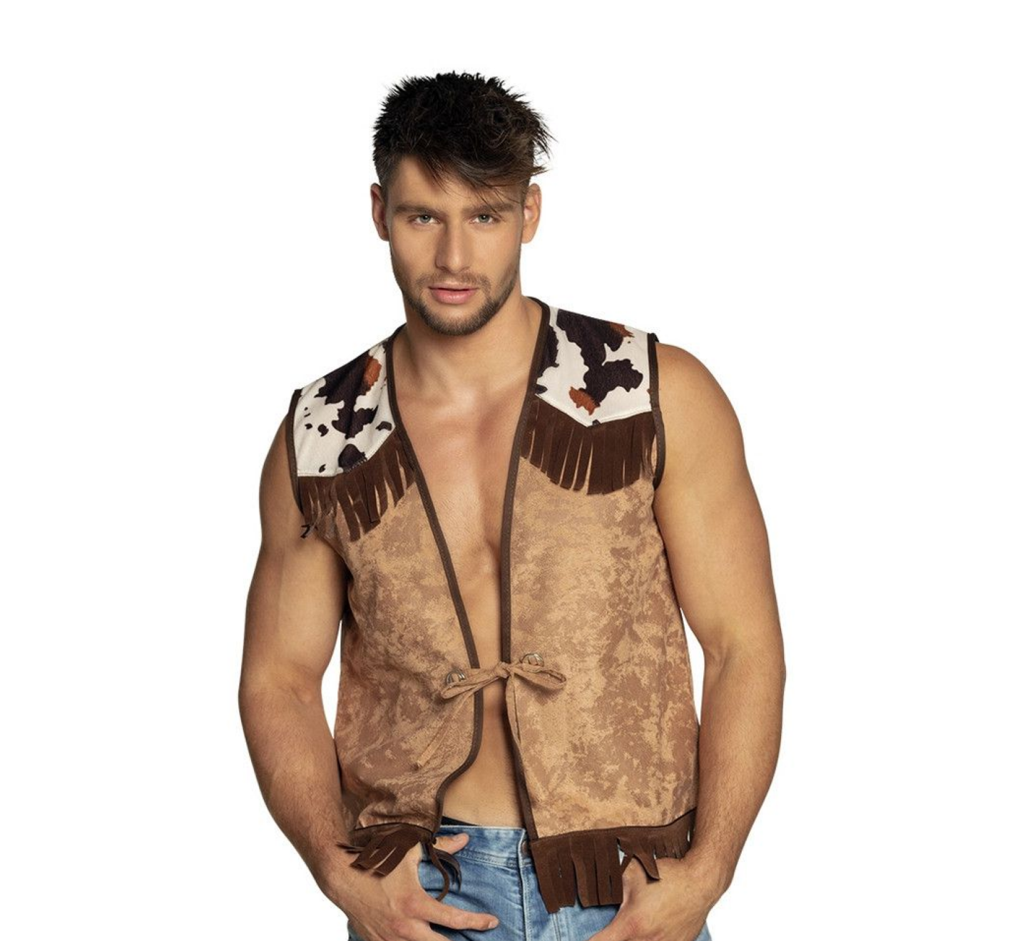 Bruin cowboyvest van het merk PartyXplosion. Dit vest is armloos, heeft aan de bovenkant een koeienprint en aan de onderkant franjes.