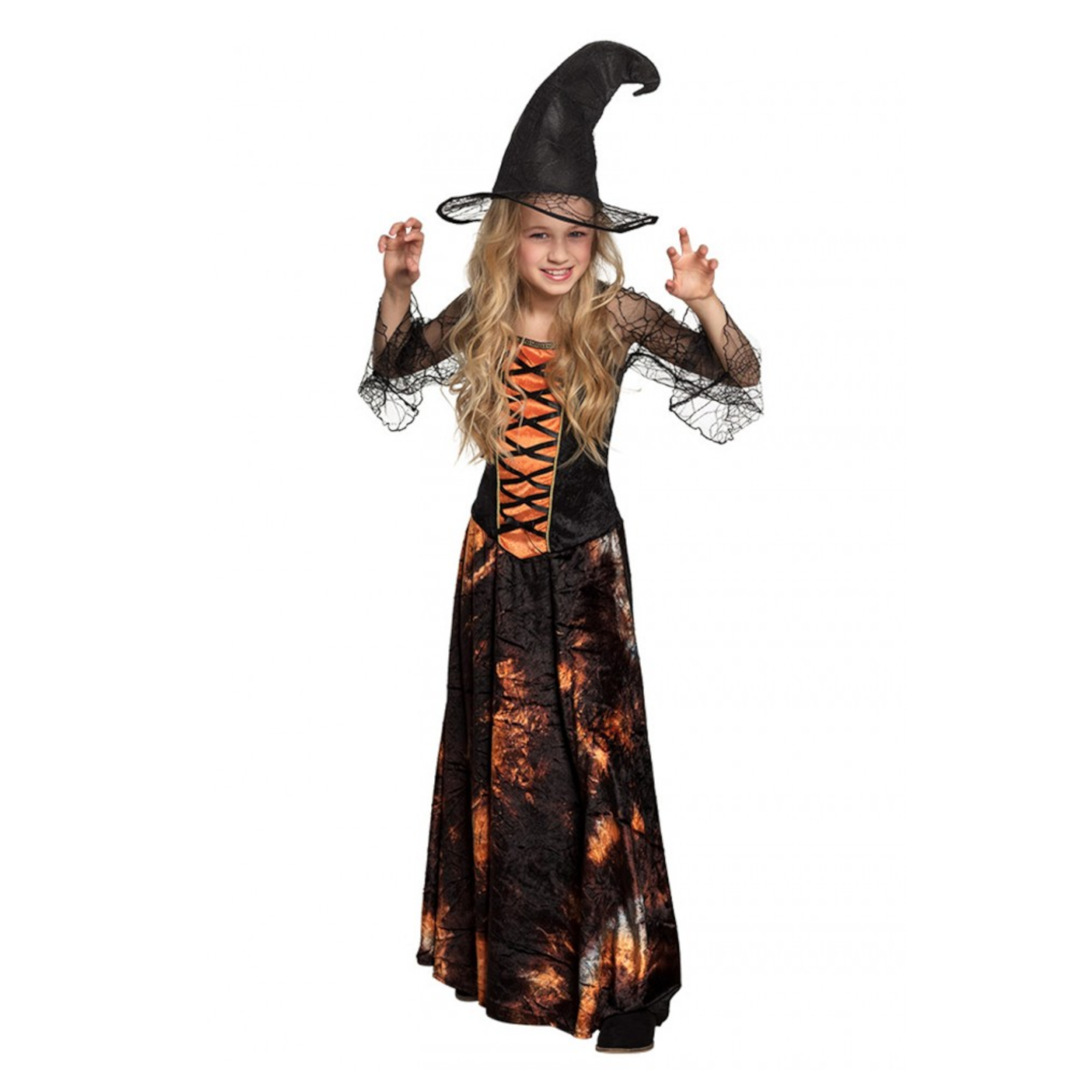 Zwart met oranje heksenkostuum van het merk PartyXplosion. Dit halloween kostuum is geschikt voor kinderen van 7 t/m 9 jaar en bestaat uit een jurk en een hoed.