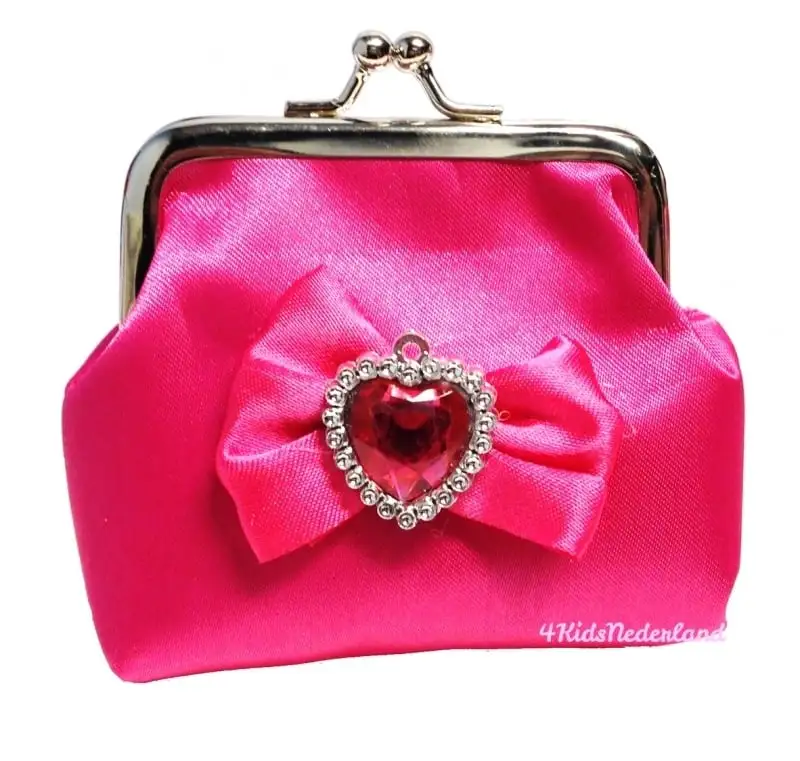 Lief Prinsessen Portemonneetje roze met hartsteentje, strikje en knip sluiting. Een echte prinses bewaart haar centjes en diamantjes in dit lieve portemonneetje!