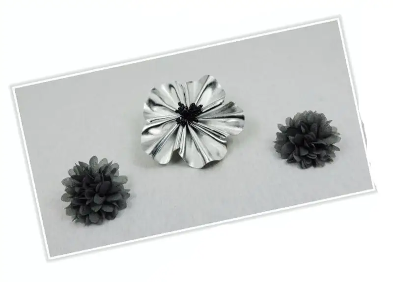 Meisjesschoenen met hakje in zilver met twee bloemclips en een bloem broche haarspeld. De bloem broche haarspeld is gemaakt van hetzelfde materiaal in dezelfde kleur als het schoentje en kan zowel in het haar als gespeld op kleding gedragen worden. De bloemclips kunnen op de neus van de schoen gedragen worden. De bloemclips kunnen, vanwege de clip op de achterzijde van de bloem, heel eenvoudig aan de schoen bevestigd worden.