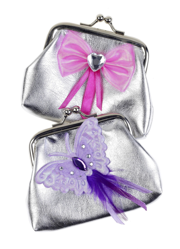 Leuk glitter knip portemonneetje in het zilver met roze strikje of paarse vlinder.