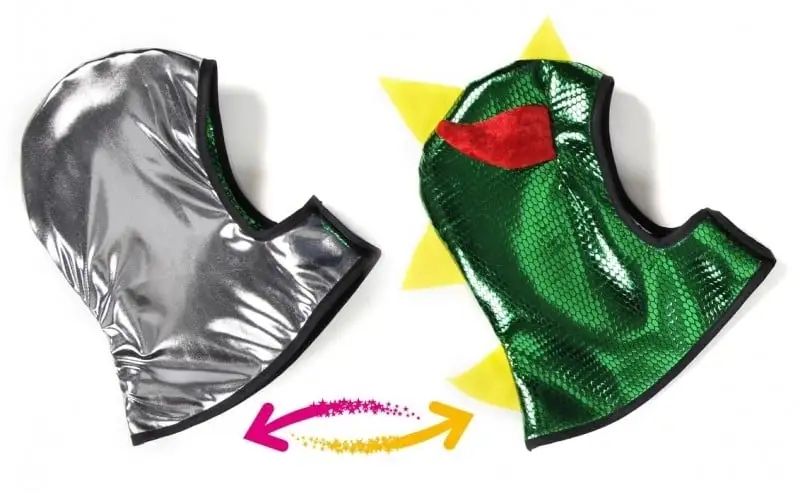 Super stoer hoofdmasker Ridder – Draak. Aan de ene zijde ben je een ridder, doe je het binnenste buiten, dan ben je de draak! Past ook goed bij de Ridder – Draak Cape!